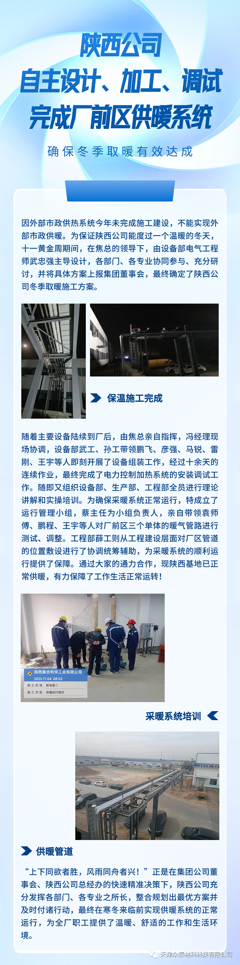 為保證陜西公司能度過一個溫暖冬天,十一黃金周期間,在陜西公司焦總的帶領(lǐng)下,由設(shè)備部電氣工程師武忠強(qiáng)主導(dǎo)設(shè)計,各部門、各專業(yè)協(xié)同參與、充分研討,最終確定了陜西公司冬季取暖施工方案。通過大家通力合作,現(xiàn)陜西基地已正常供暖,有力保障了工作生活正常運轉(zhuǎn)!